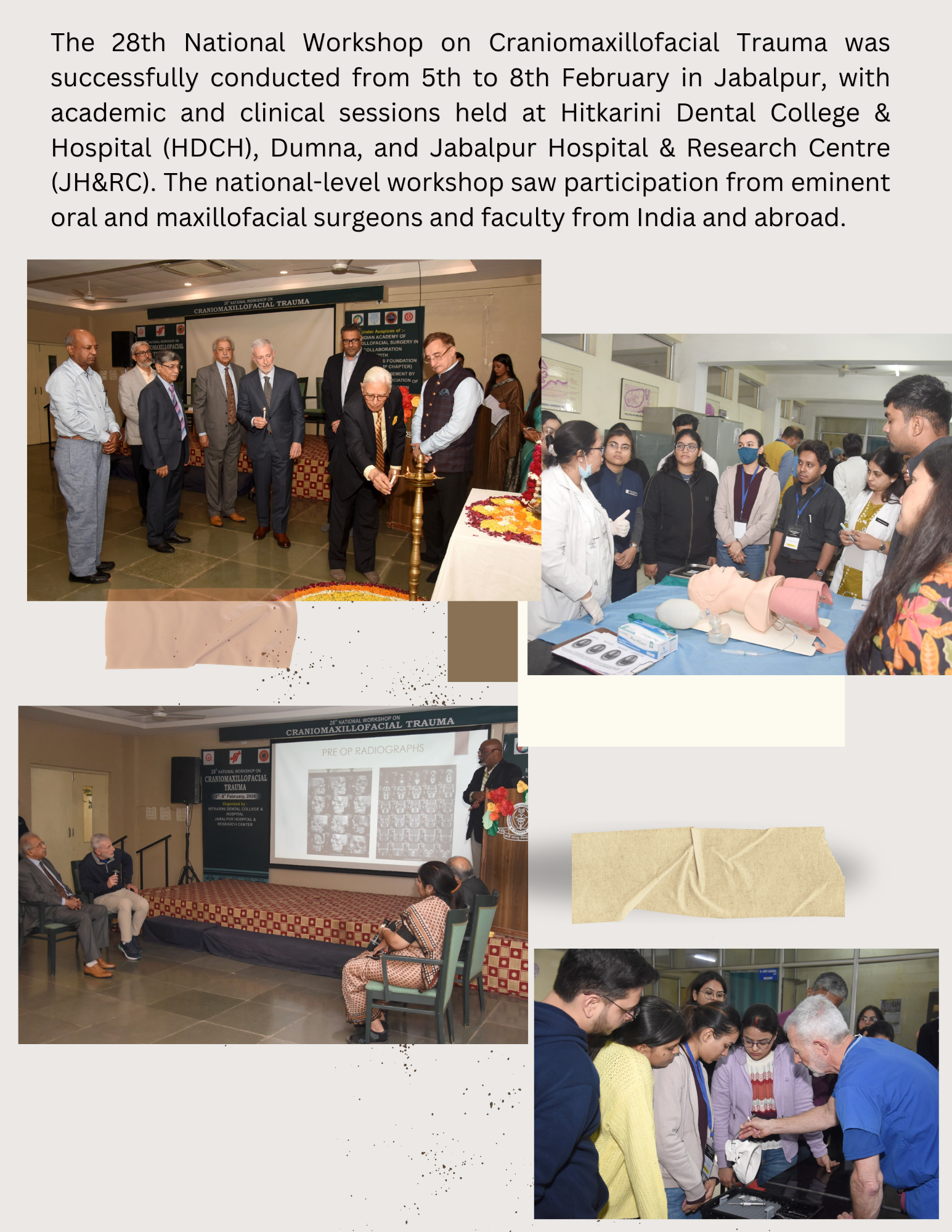 This workshop has been focusing on Basic and Advanced Techniques in the field of Oral and Maxillofacial Surgery for the last 25 years. It takes place in collaboration with Jabalpur Hospital and Research Centre and Hitkarini Dental College which has been an integral part of this workshop for the last 18 years.